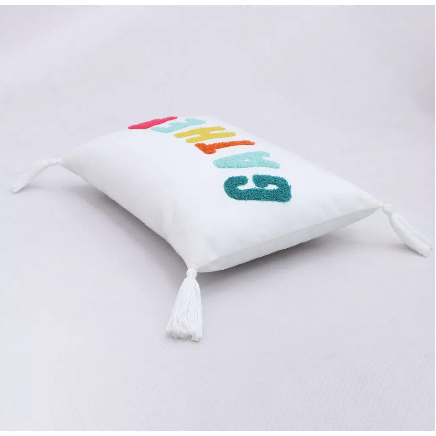 Add warmth and cheer to your home with this vibrant “Gather” decorative pillow! Featuring bold, multicolor tufted lettering on a soft white background and tassel corners, it’s a perfect accent for fall, Thanksgiving, or cozy farmhouse décor.