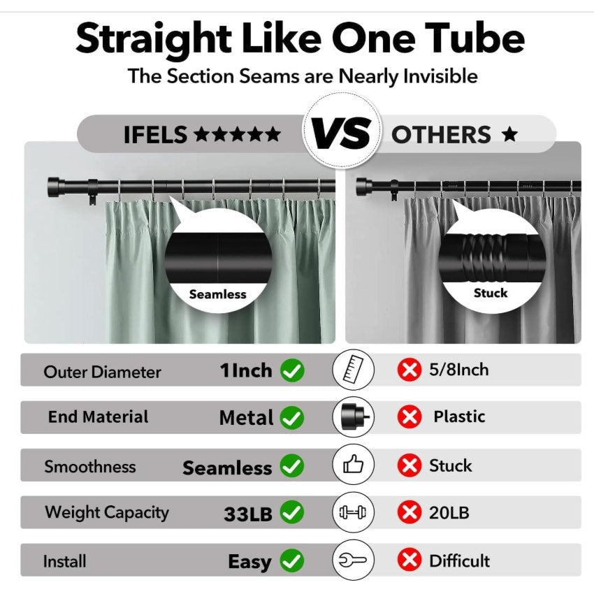 Black heavy duty curtain rods are constructed from heavy duty metal. Our black curtain rods have a thickness of 0.7mm and an outer diameter of 1 inch, Other curtain rods have a thickness of 0.6mm and a diameter of 5/8inch, So our curtain rods are stronger, enabling them to support up to 33 LB