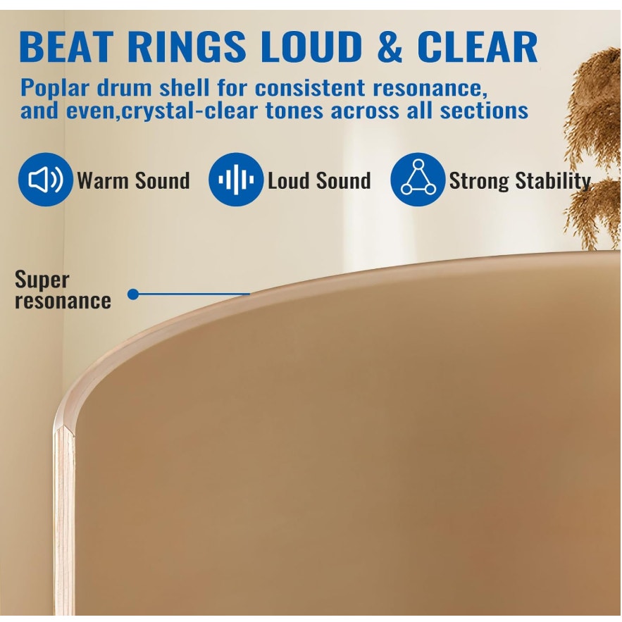 [Quality Real Wood Shells]: Crafted with genuine poplar wood shells, this 3-piece drum set delivers a rich, warm tone and excellent resilience. The sturdy construction ensures durability for long-term music practice